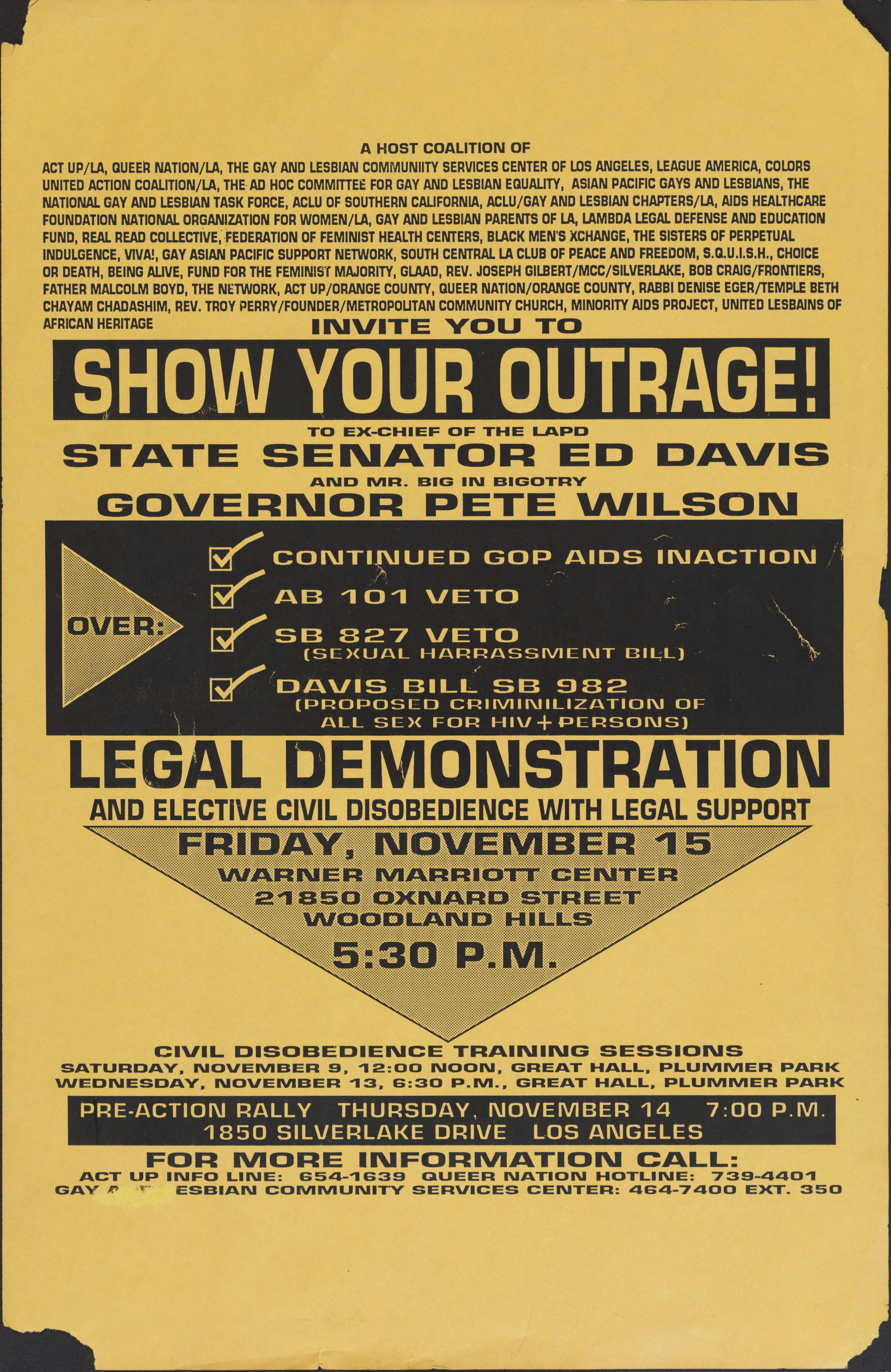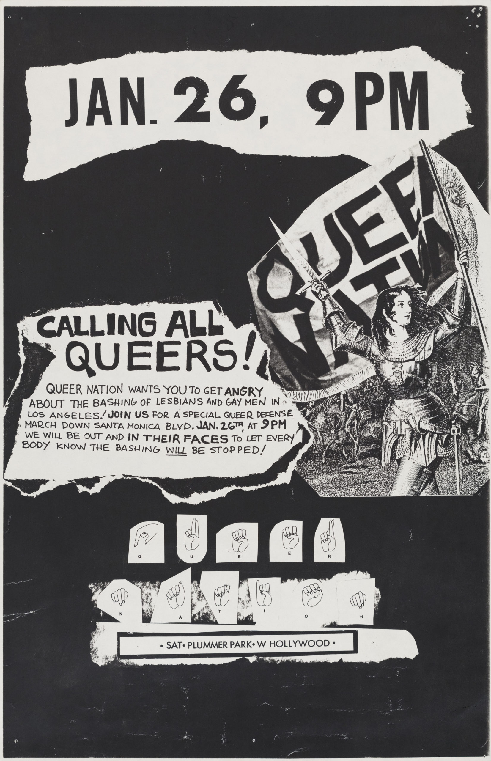 Days of Rage is a web exhibition that enlivens historical activist posters from ONE Archives at the USC Libraries through tactile analysis and storytelling. Grounded in the experiences of activists and graphic designers Alan Bell, Daniel Hyo Kim, Chandi Moore, Silas Munro, Judy Ornelas Sisneros, and Jordan Peimer, the exhibition positions LGBTQ+ graphic design as embodied in community realities and histories, producing subjective reflections on the interdependence of design and activism. In assembling the exhibition, these community experts chose five posters from the recently digitized poster collection at ONE Archives at the USC Libraries. Over a sequence of stylized videos that emphasize the choreography of their hands, the invited experts reflect on their selections, allowing the posters to guide ruminations on design language, community responsiveness, erasure and history, and the affiliative force of activist politics. Their hands, voices, and memories serve as interpretive guides in transmitting knowledge, thereby queering the mode in which graphic design is displayed–which is so often static and wall-bound. From bold graphic declarations of community activation to explicit safer sex health campaigns, the posters discussed run the affective gamut, bringing up powerful feelings of rage, joy, and sorrow. Days of Rage privileges this associative and sometimes aleatory interpretation of design, and finds profound value in its capacity to serve as a roiling, continuous link to a shared sense of LGBTQ+ ancestry and struggle.