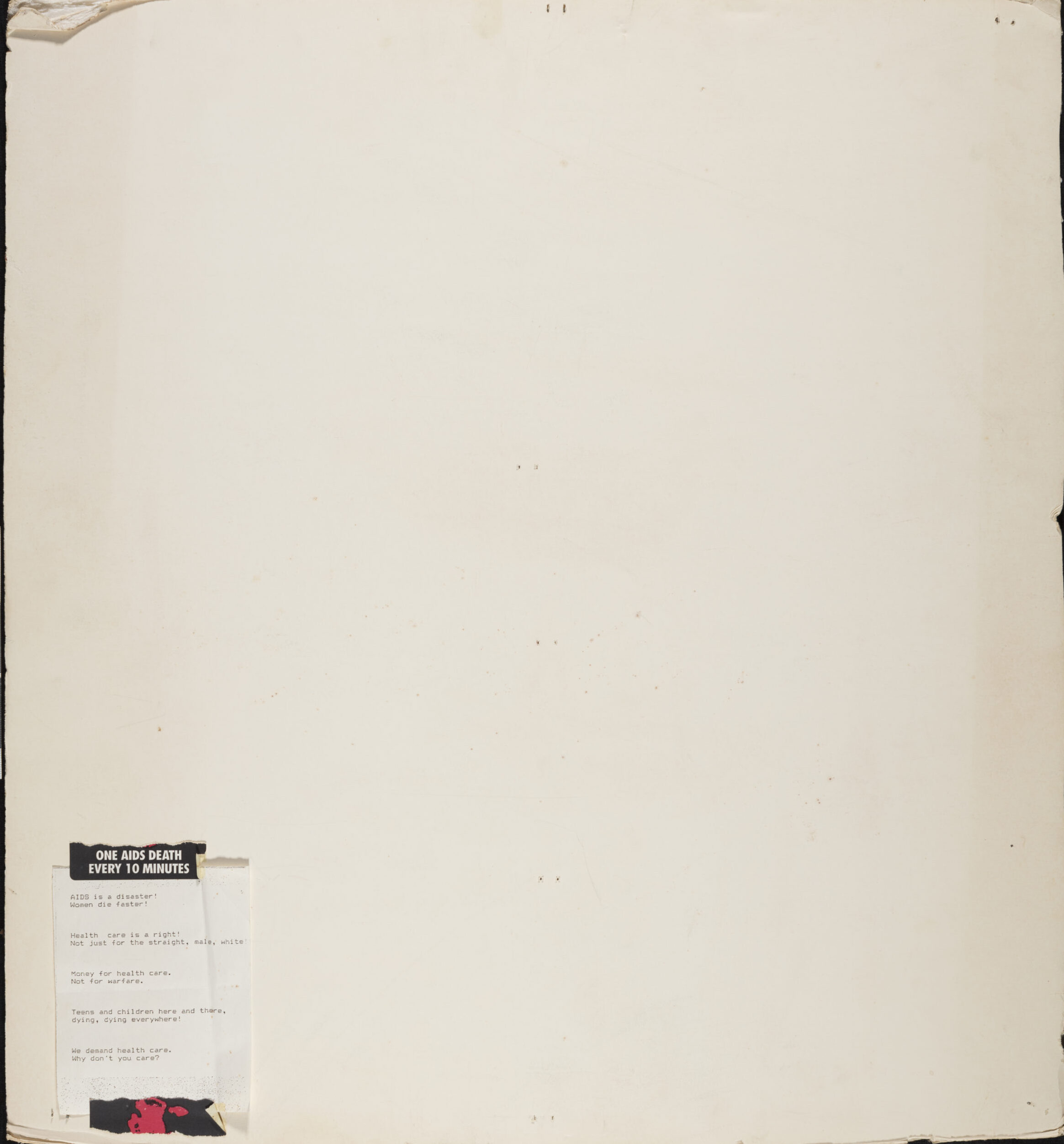 These posters, with their tombstone-like dimensions, likely served as a way to honor Sylvester and Navarro at protests after their deaths. As an ultimate reminder of both the ongoing urgency of HIV/AIDS activism and education, as well as activist collectivity, a list of protest chants that the activist holding Navarro’s poster might have read from is adhered to its back, along with Gran Fury’s iconic graphic of a bloodied hand: